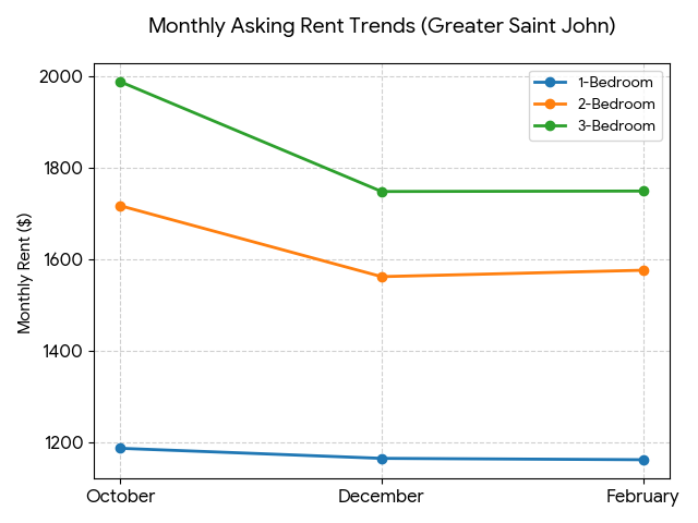 The Saint John rental market saw an 11.7% correction in asking rents between Q4 2025 and Q1 2026. While Class A (Luxury) rents dropped 21%, the “Sweet Spot” for stability remains in Class B units priced between $1,450 and $1,525.